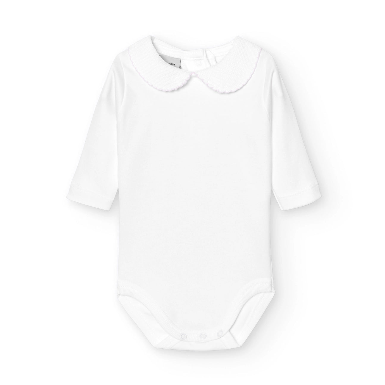 Myk og behagelig body i 100 % bomull, med søt krage pyntet med lyserosa kant. Praktisk design som gjør på- og avkledning enkel, samtidig som den er myk og skånsom mot babyens sensitive hud. Perfekt til hverdagsbruk eller som en del av et fint antrekk.💗