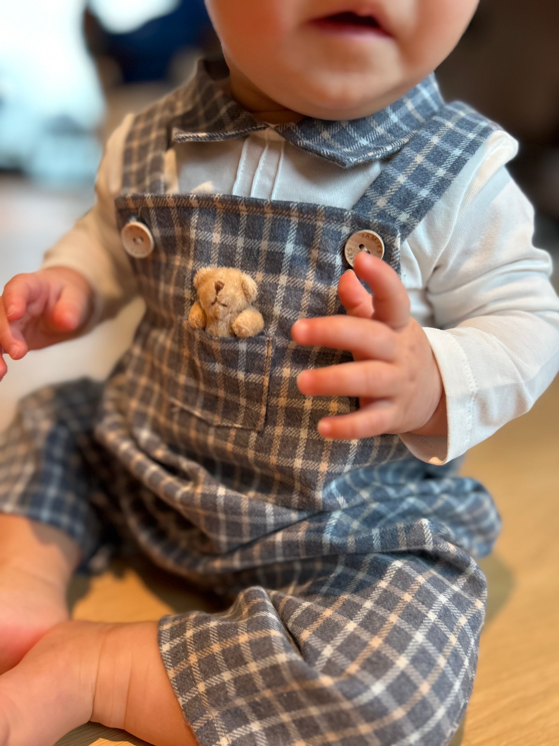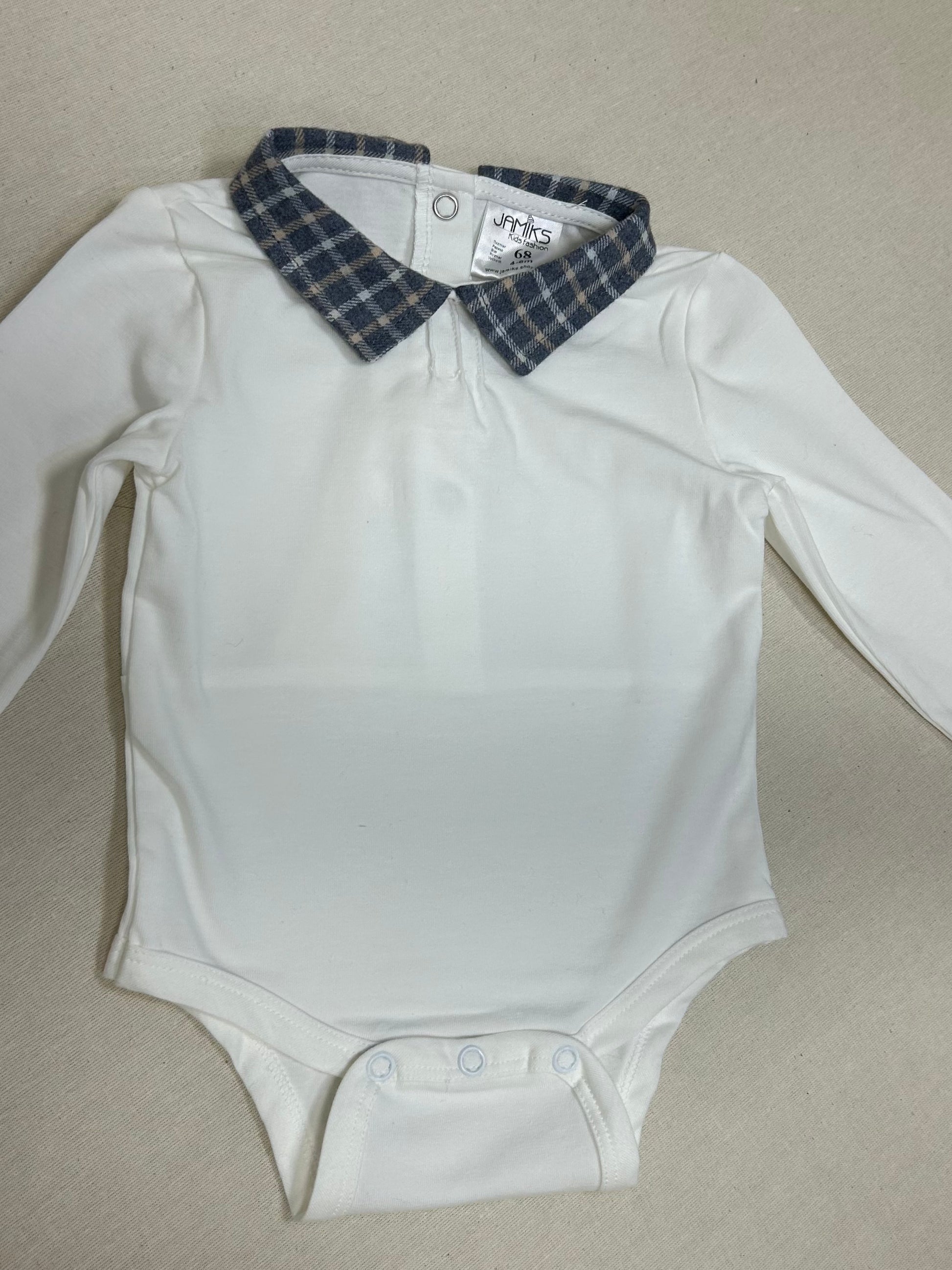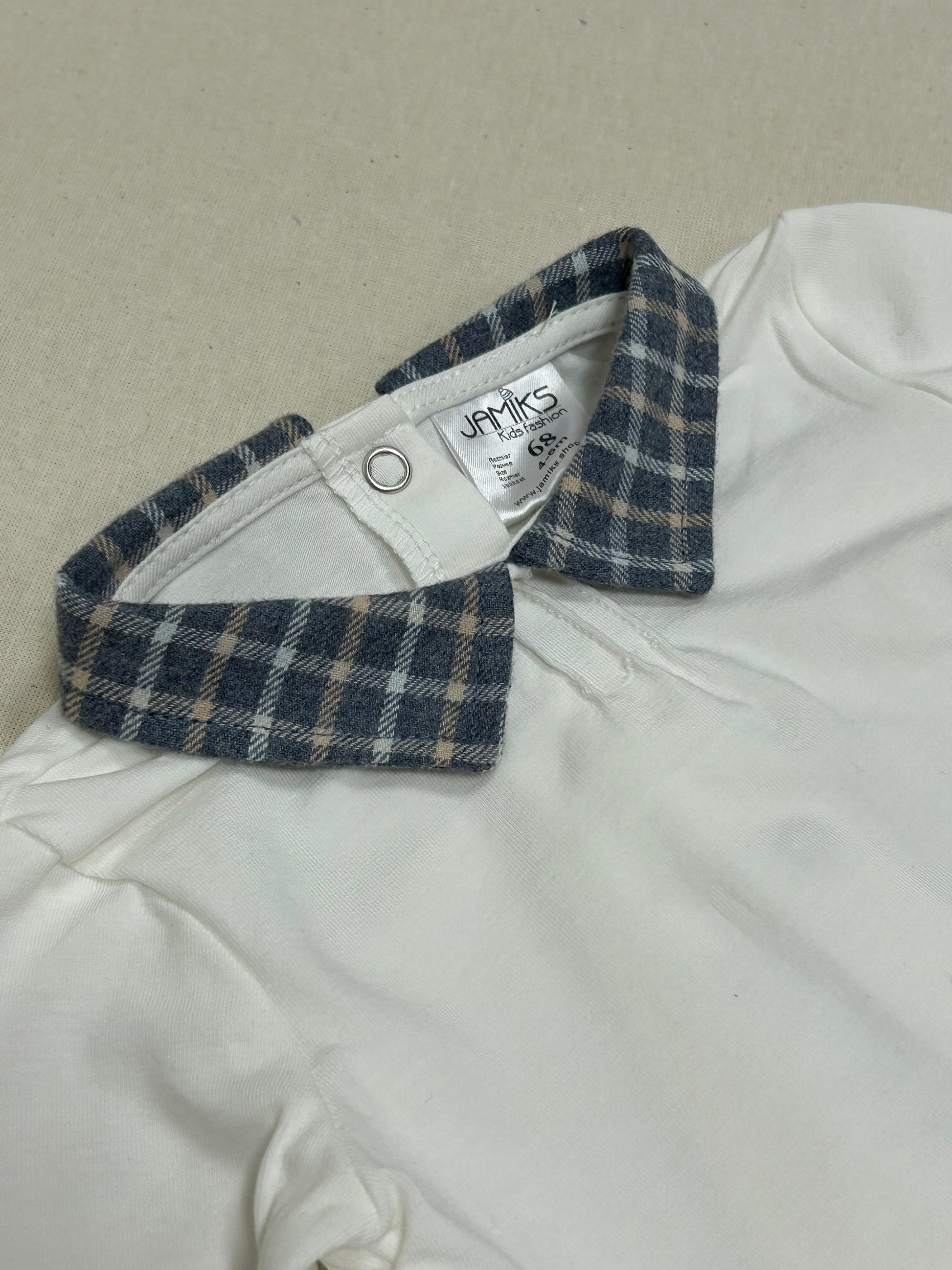 Myk og behagelig hvit body i 100 % bomull, med en søt krage i rutete gråblå flanell. Perfekt å kombinere med våre rutete flanelbukser og snekkerbukser for et komplett, koselig antrekk til barnet. Enkel å ta på og av, og behagelig mot sensitiv hud.🐻