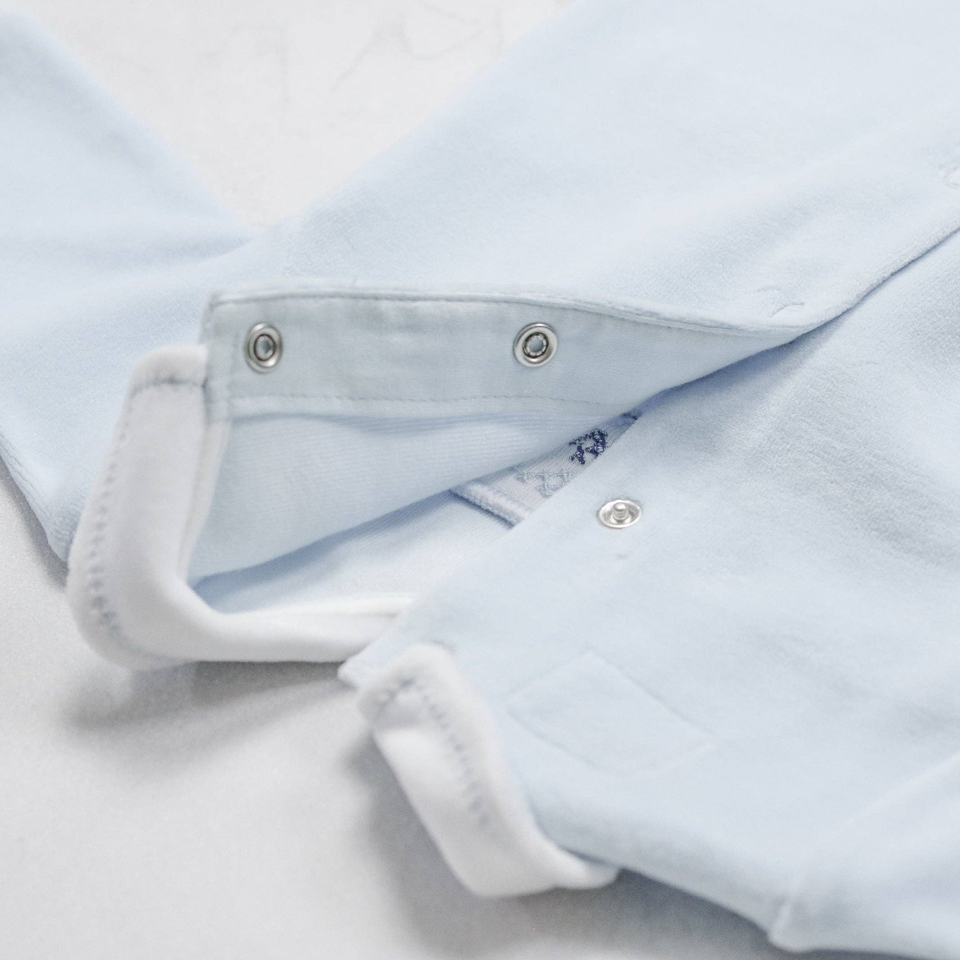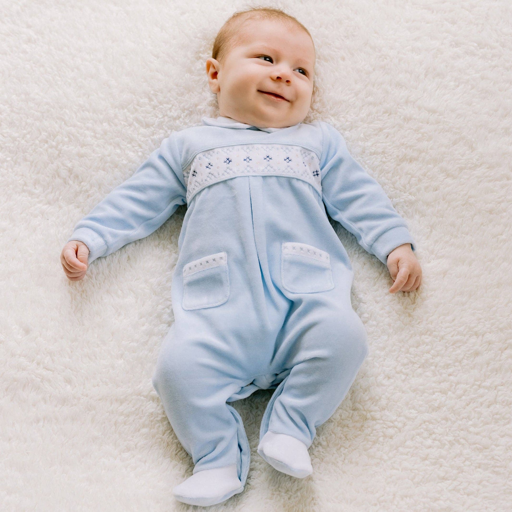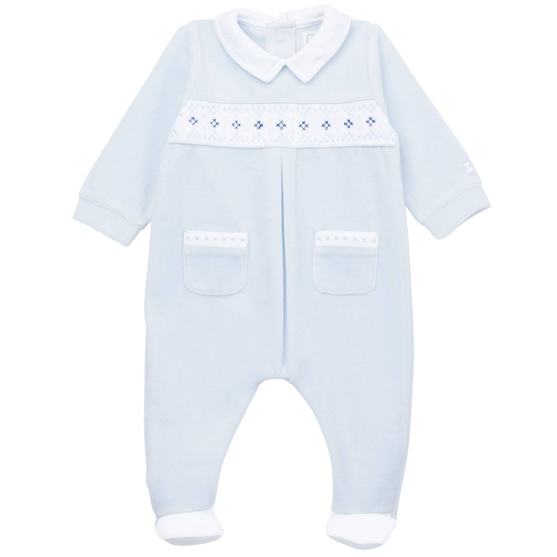 En utsøkt sparkedress i myk velour, med vakkert brodert brystparti i dype blåtoner. De delikate detaljene, små lommer, hvit krage og kontrastsøm - gir et tidløst uttrykk. Praktisk åpning med trykknapper bak og langs bena gjør stell enkelt 🧸💙