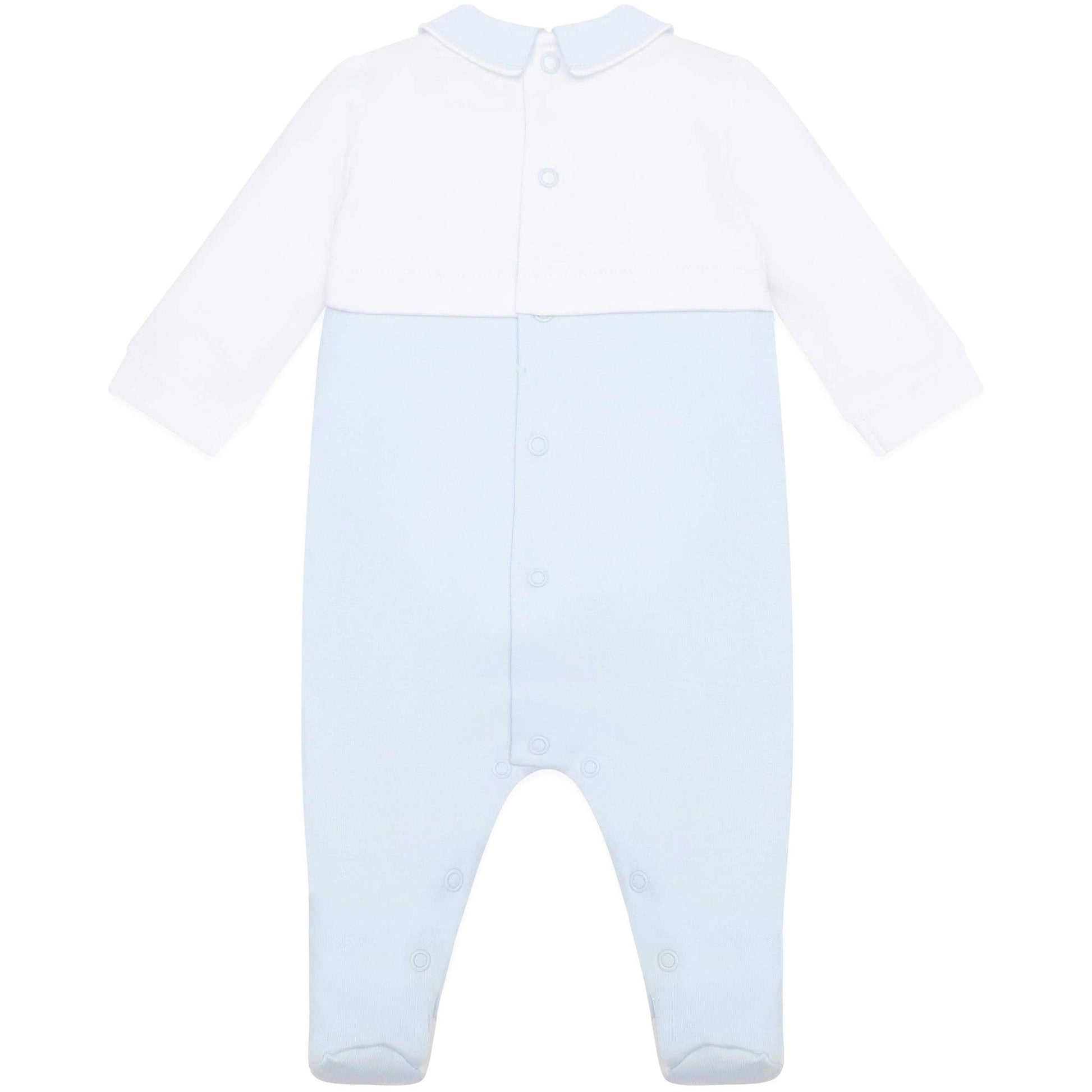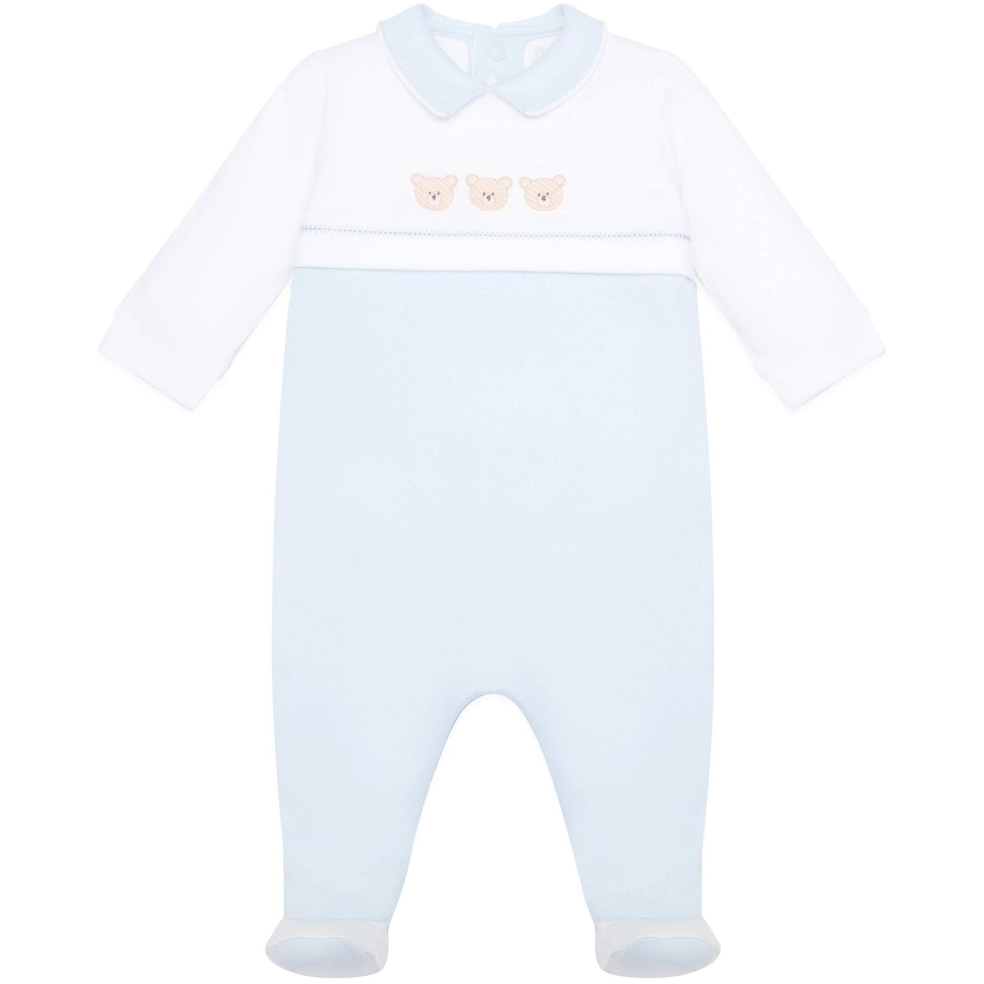 En tidløs sparkedress i 100 % myk bomull med hvit overdel, lyseblå krage og vår signaturfarge i blått. De tre små bjørnebroderiene og den matchende luen gjør antrekket komplett, perfekt som den første sparkedressen til en liten gutt. Trykknapper bak og langs bena gjør stellet enkelt 🐻✨