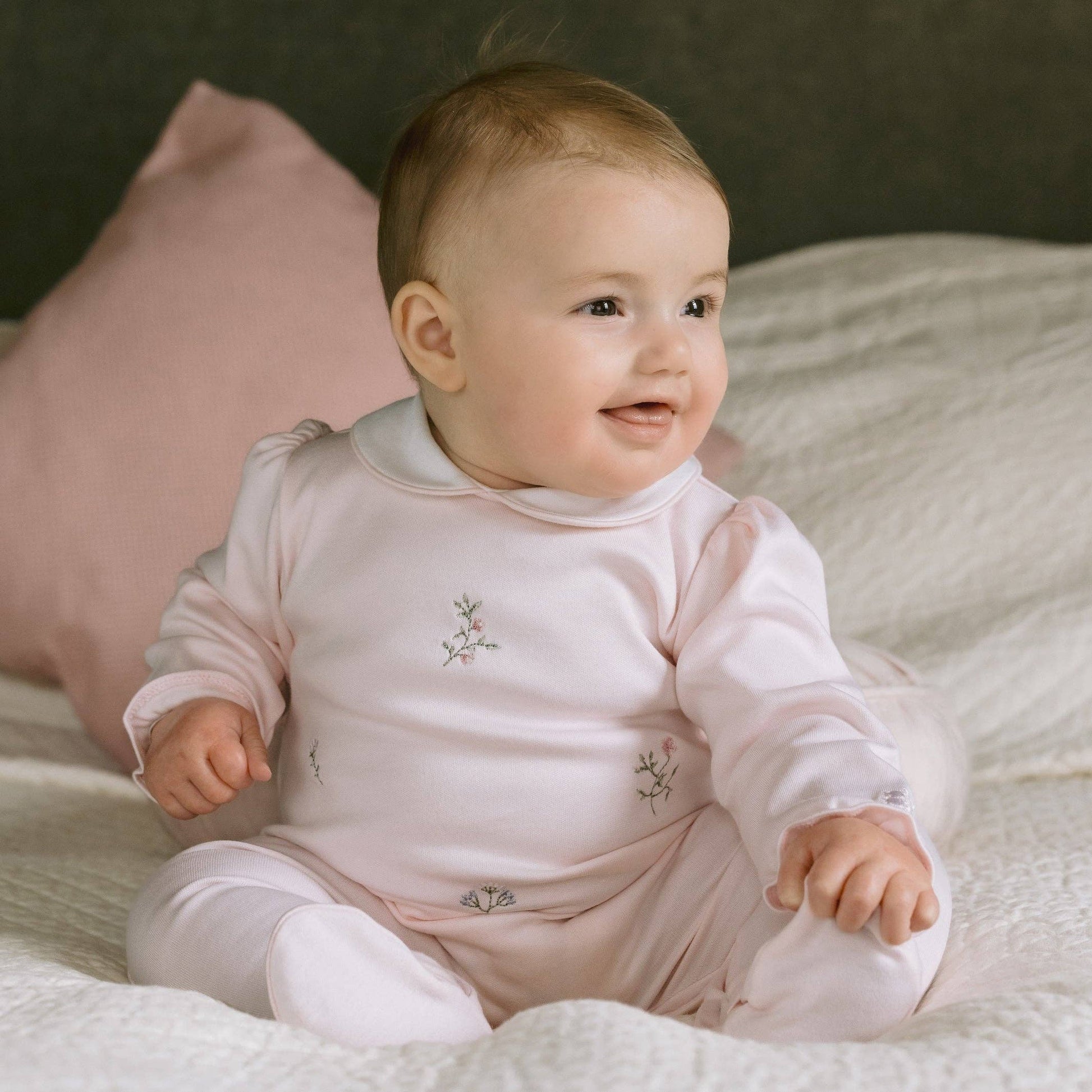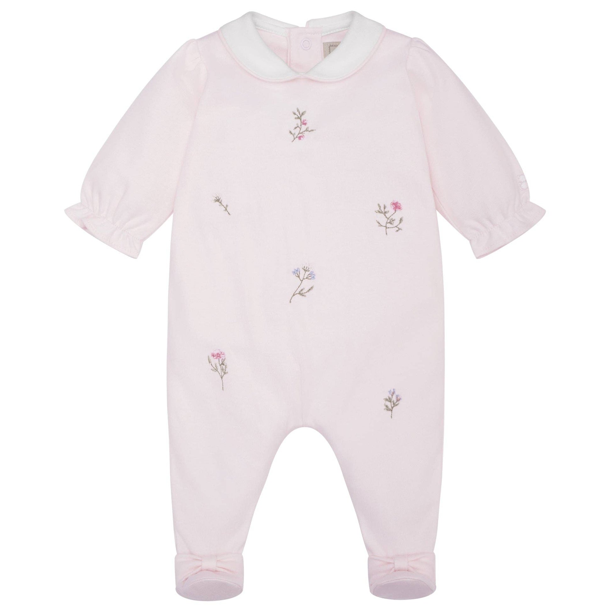 En nydelig sparkedress med delikate blomsterbroderier, rund hvit krage med rosa kant og små volanger på ermene. Sløyfer ved føttene gir en ekstra sjarmerende touch. Laget i 100 % myk bomull - perfekt som gave til en ny liten jente. Trykknapper bak og langs bena gjør stellet enkelt 🌸✨