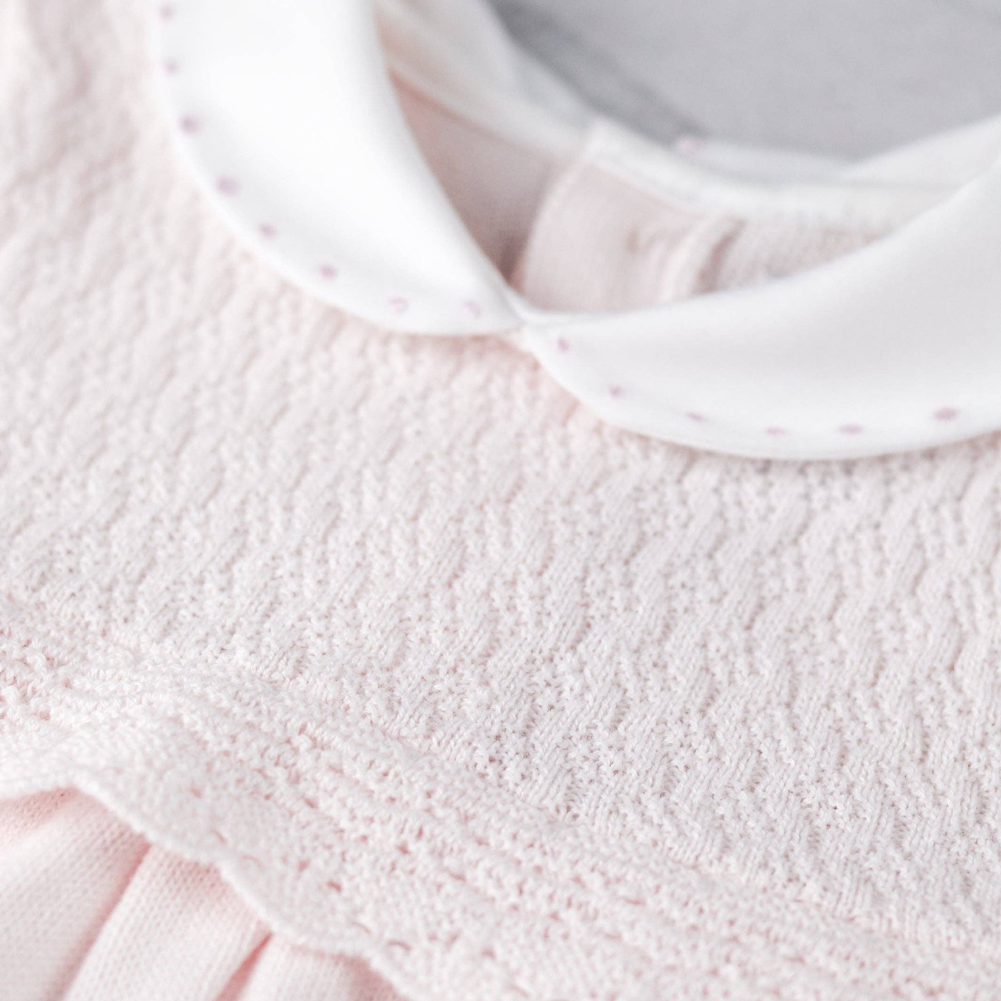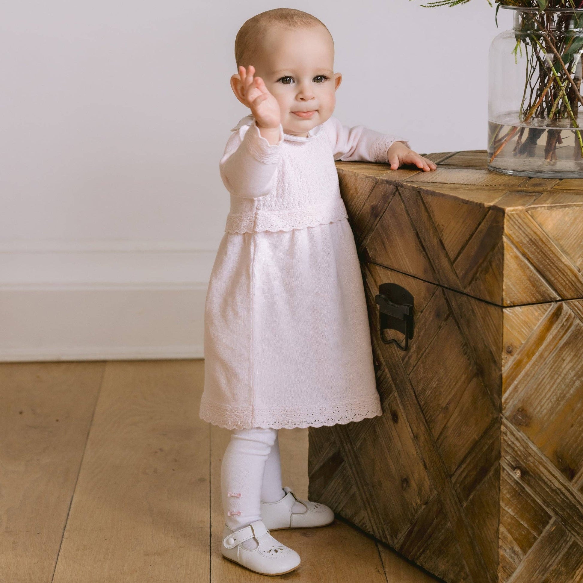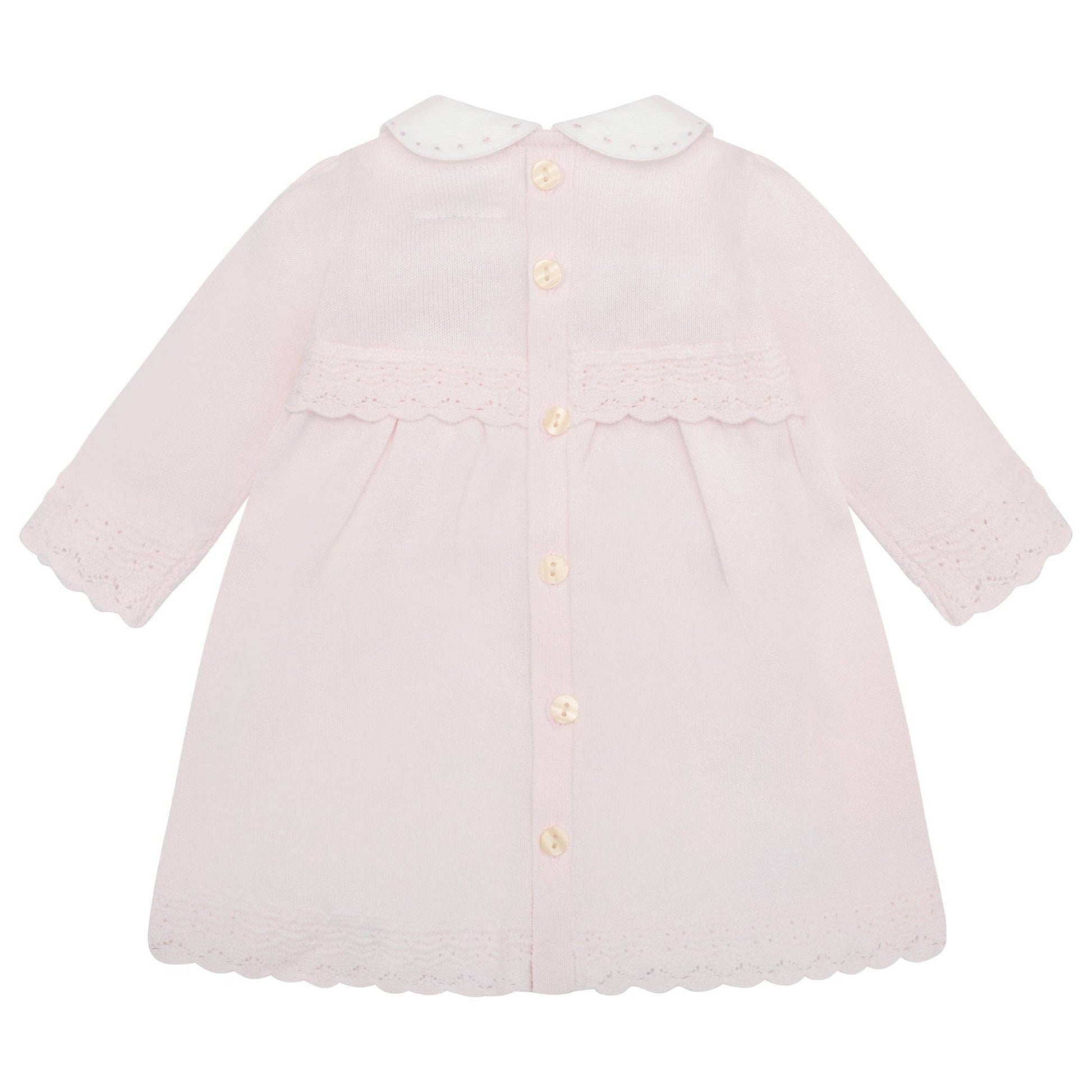 Kjolen har et delikat blomstermønster på bærestykket og en rund hvit krage med broderi. De dekorative ermene og kanten nederst gir et elegant preg, mens perleknapper i ryggen gjør påkledning enkelt. Kjolen leveres med hvite strømpebukser med små rosa satengsløyfer - en søt og fullendt look for små prinsesser. Laget i 100 % bomull 💞🎀