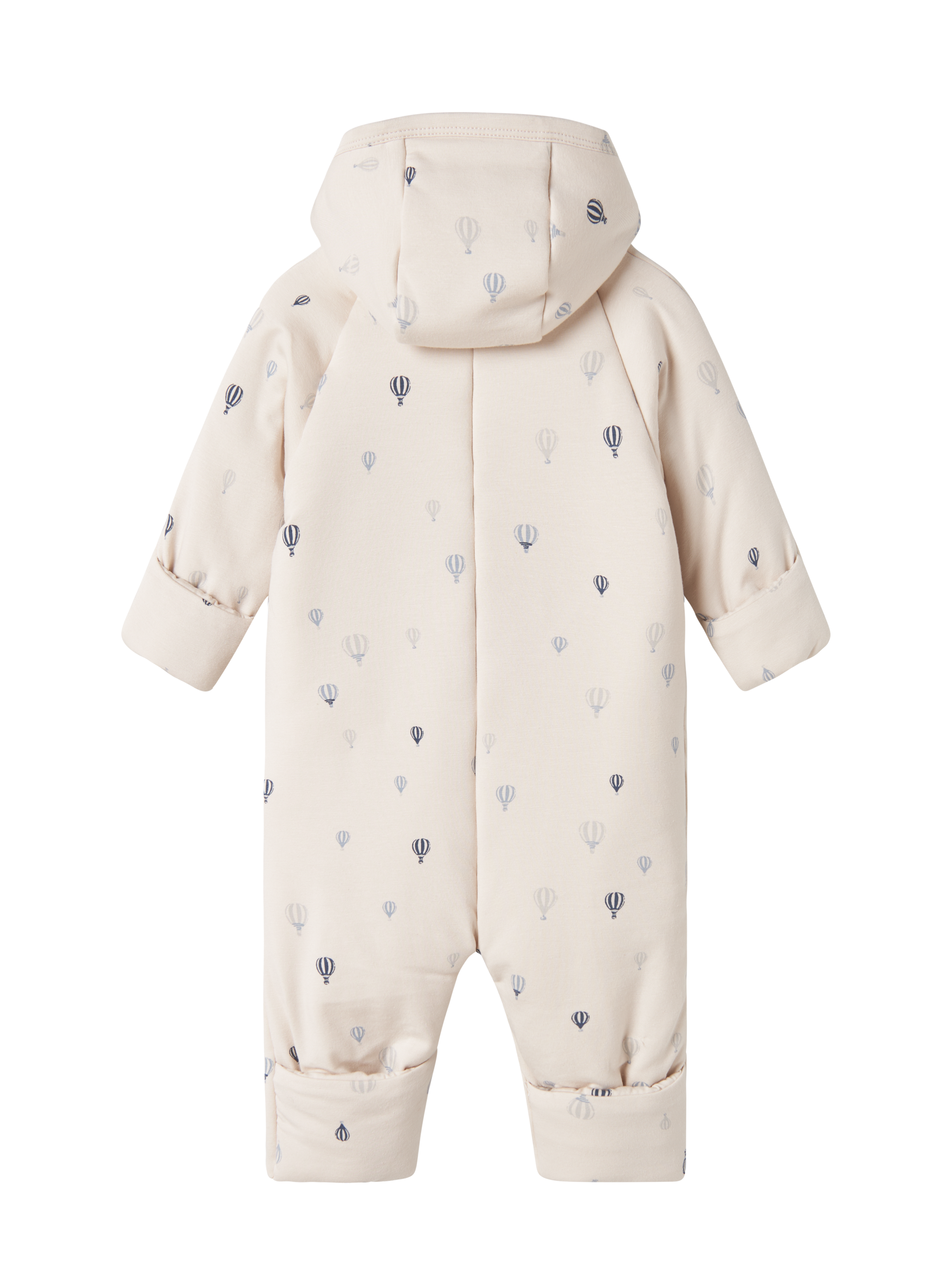 Varm, polstret jumpsuit for nyfødte med hette og knappelukking.