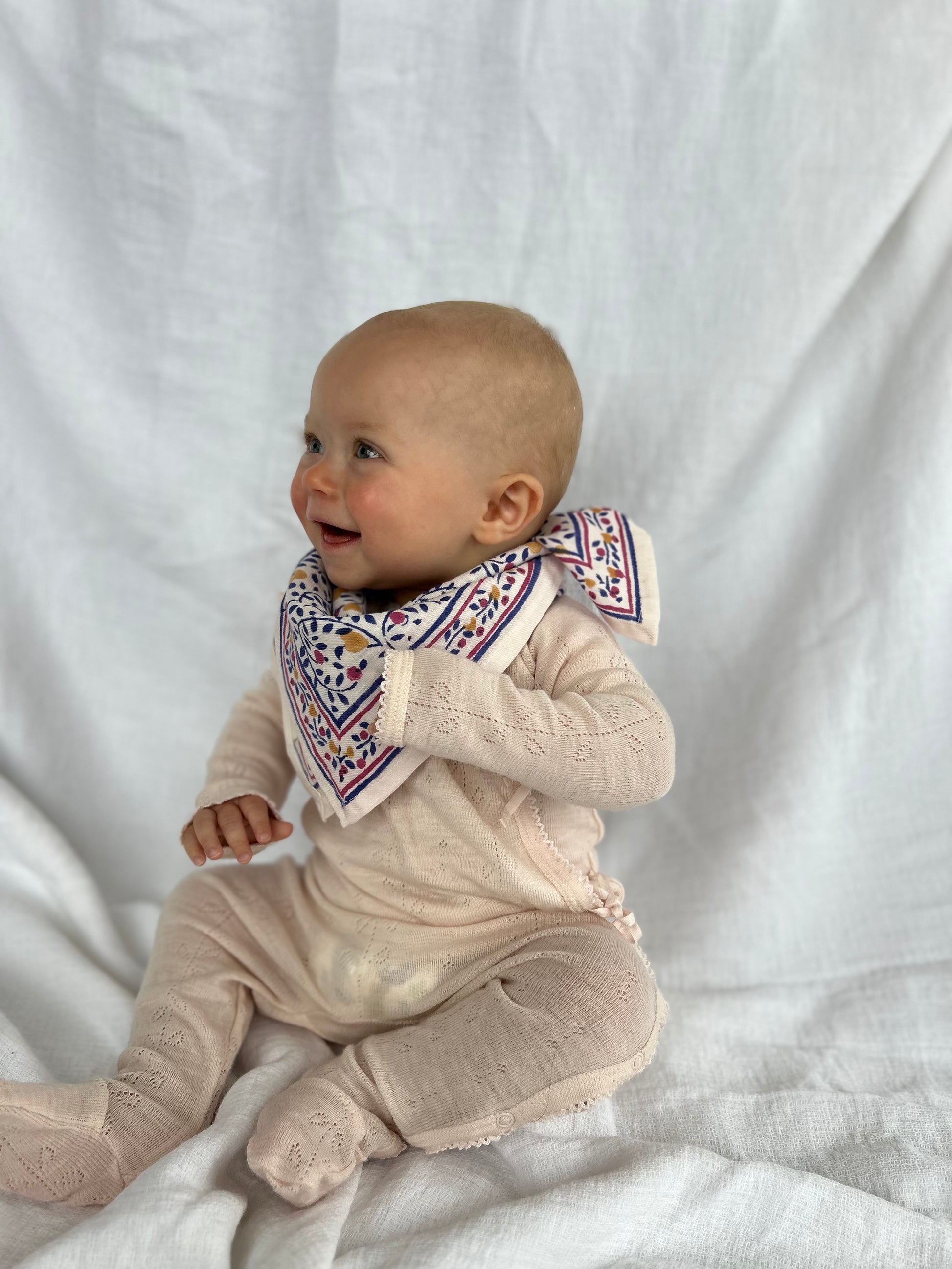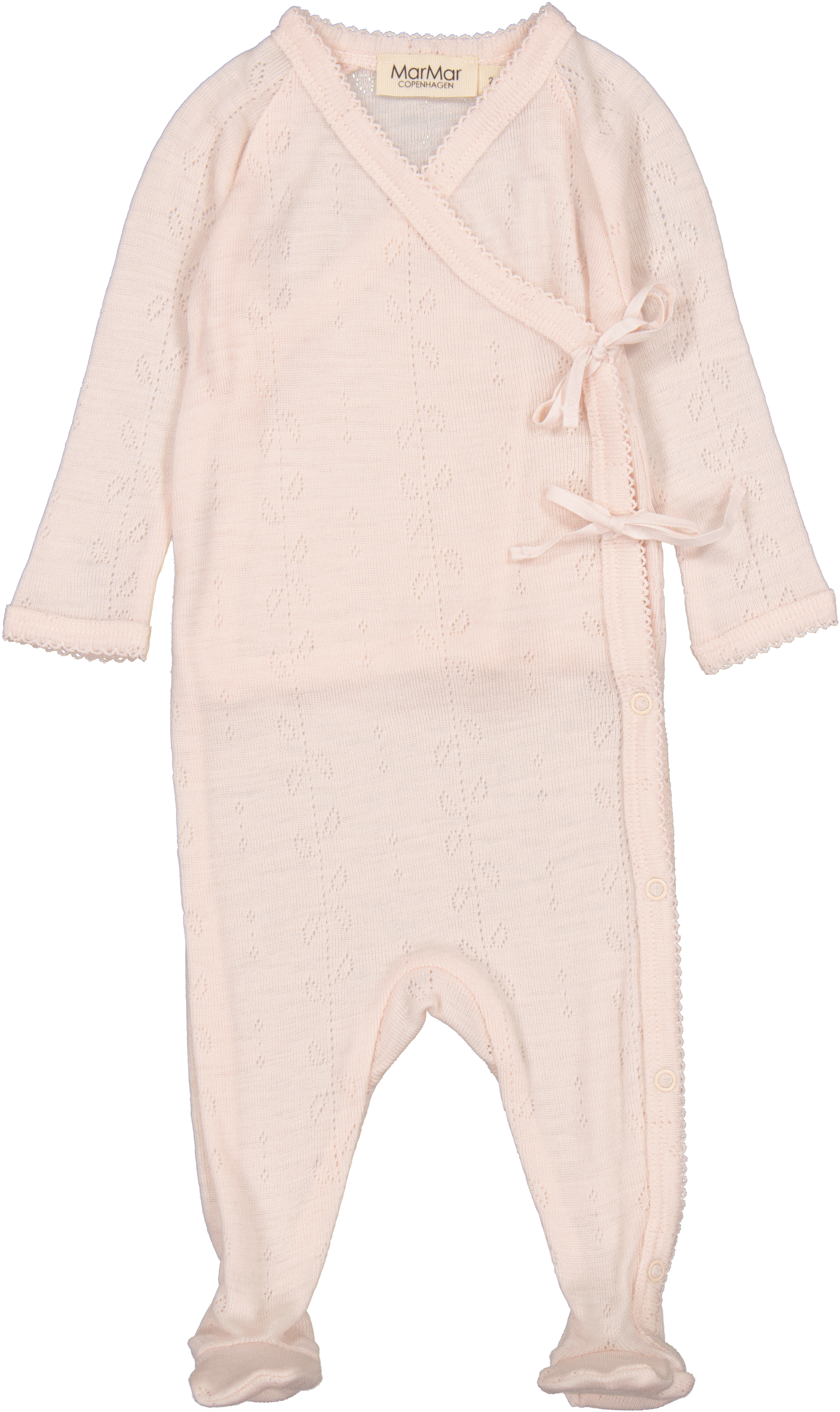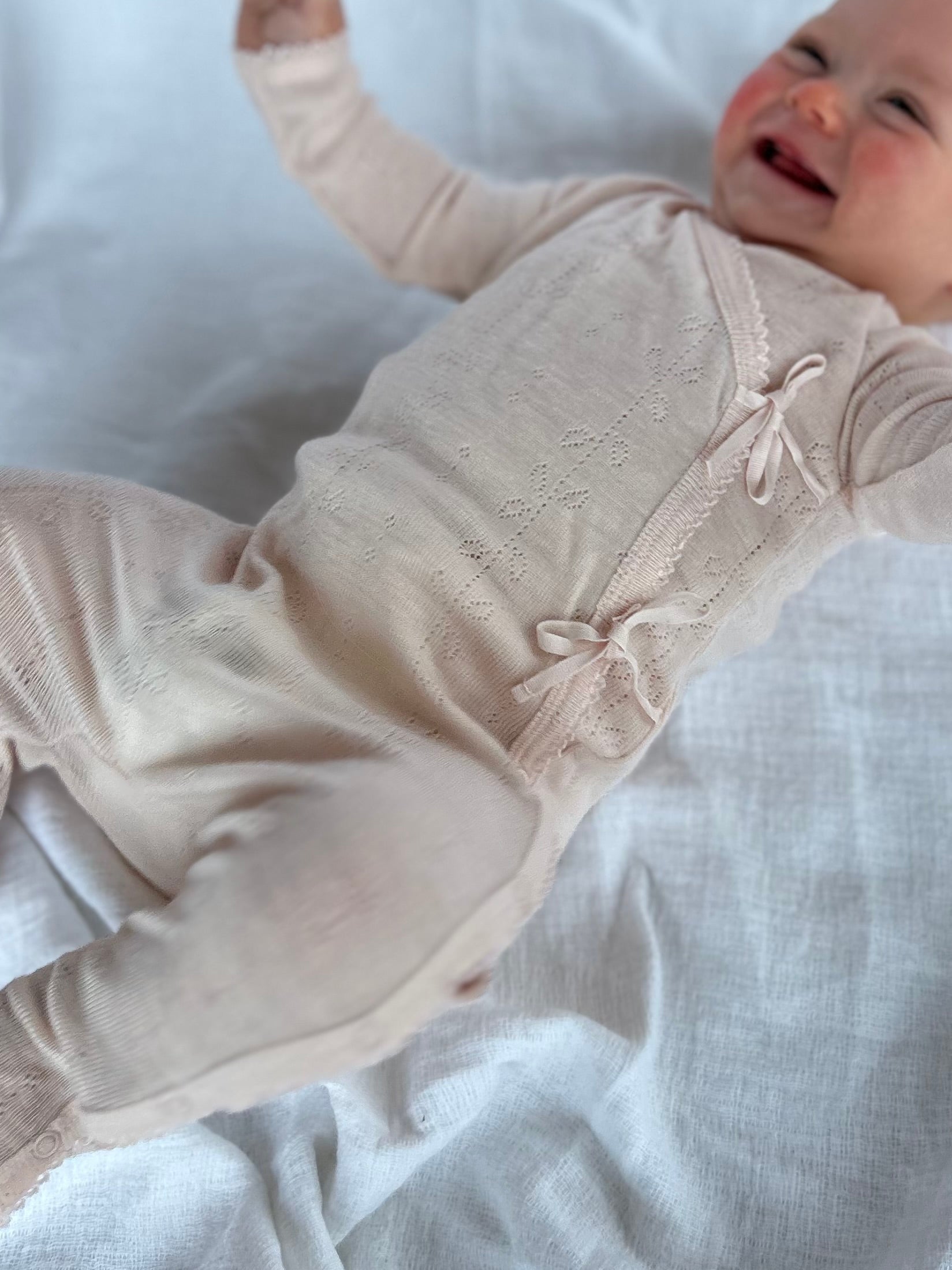 Nydelig nyfødt heldress i 100 % merinoull. Myk, lett og luftig kvalitet med pointelle hullmønster, føtter, trykknapper og knyting for enkel påkledning.