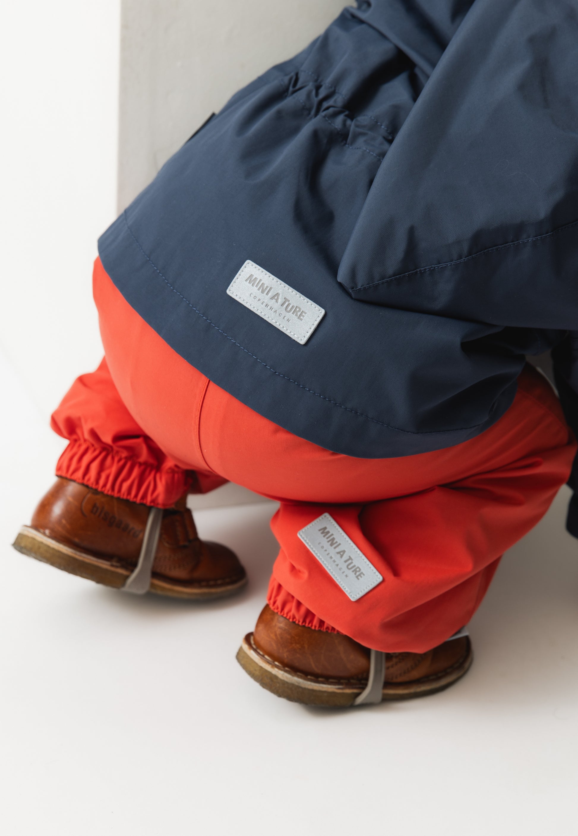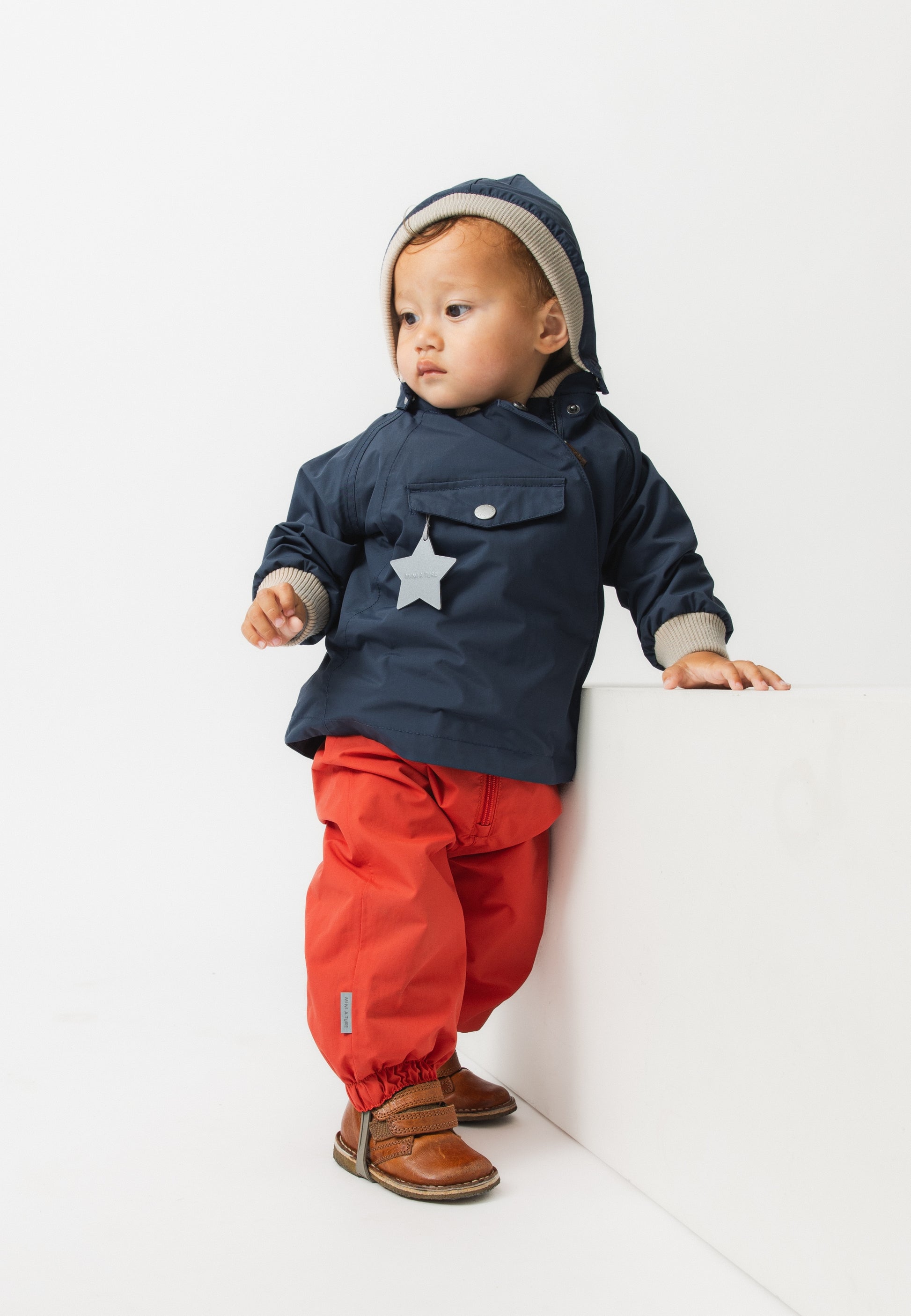 Størrelser opptil 18 mnd / 86 har ribbekrage for ekstra komfort, mens større størrelser har vanlig krage. Jakken har et lett fôr i bomullsblanding. MINI A TUREs signatur-refleksstjerne er plassert i frontlommen, og en liten reflekslogo bak gir økt synlighet.