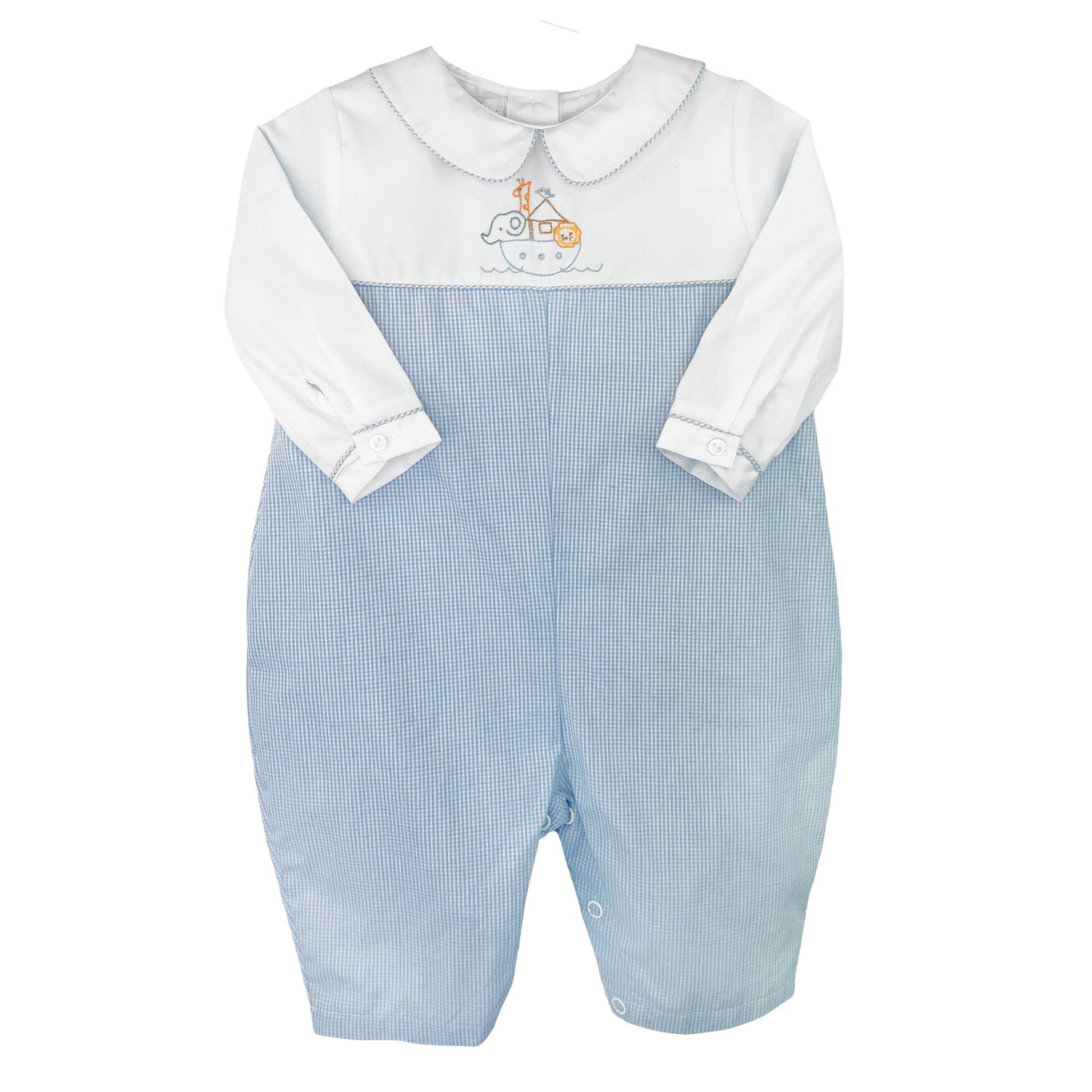 Nydelig heldress i myk lyseblå rutet bomullsblanding, med søtt Noah’s Ark-broderi foran. Langermet heldress med rund krage, lett og luftig - perfekt for de små. Maskinvask for enkel stell. 🛶💙