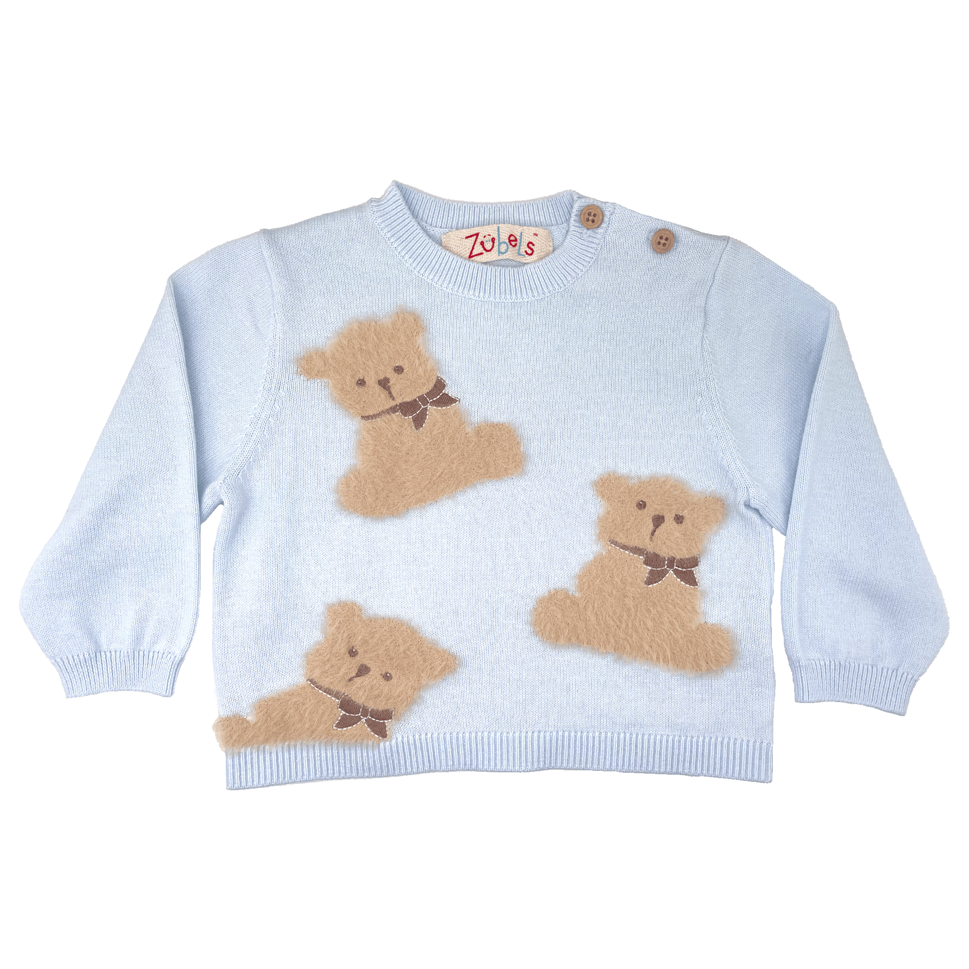 Klem og lek med denne myke lyseblå genseren med søtt bjørnemønster - en sikker favoritt for små eventyr! Laget i 100 % bomull med miljøvennlige fargestoffer. Maskinvask, tørk flatt. 🐻💙