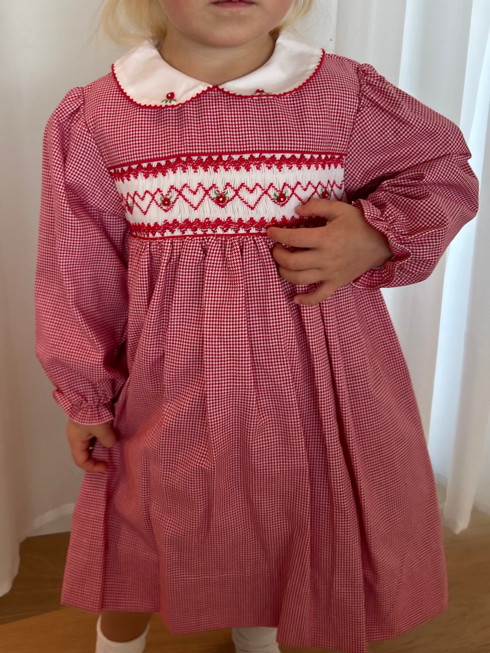 Nydelig langermet kjole i rødrutet stoff, med delikat rynking og broderi foran. Søt rund krage med dekorative kanter. For de minste størrelsene (3-12 mnd) følger matchende romper med. Lett og luftig bomullsblanding, enkel å vaske. Perfekt til alle anledninger i desember! 🎄❤️