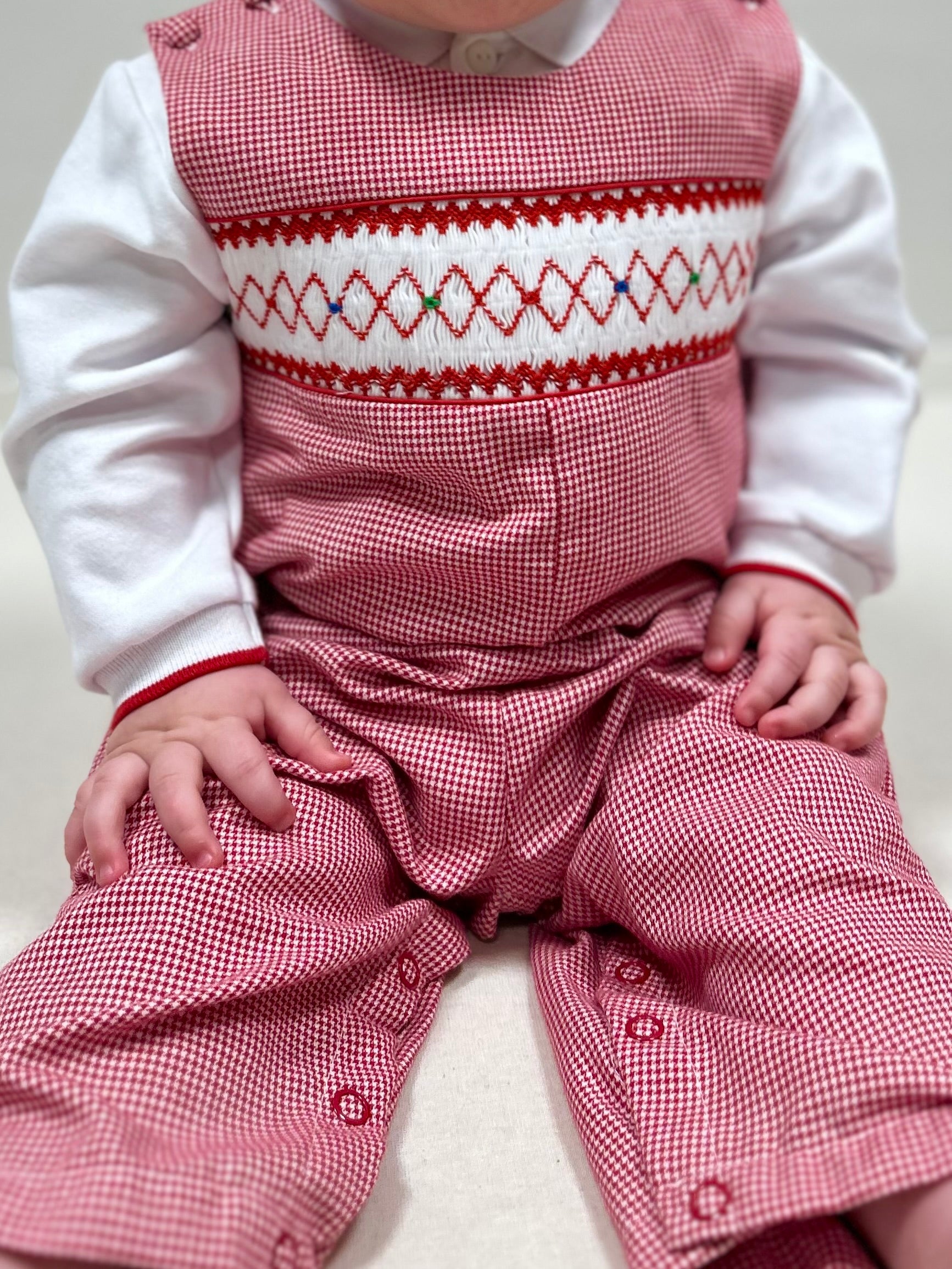 Søt og festlig snekkerbukse, perfekt for jul og høytidsfeiring! Rødrutet med broderidetaljer og hvit krage med røde kanter gjør antrekket ekstra julete. Laget i lett og luftig bomullsblanding som er enkel å vaske. Perfekt til alle anledninger i desember! 🎄❤️