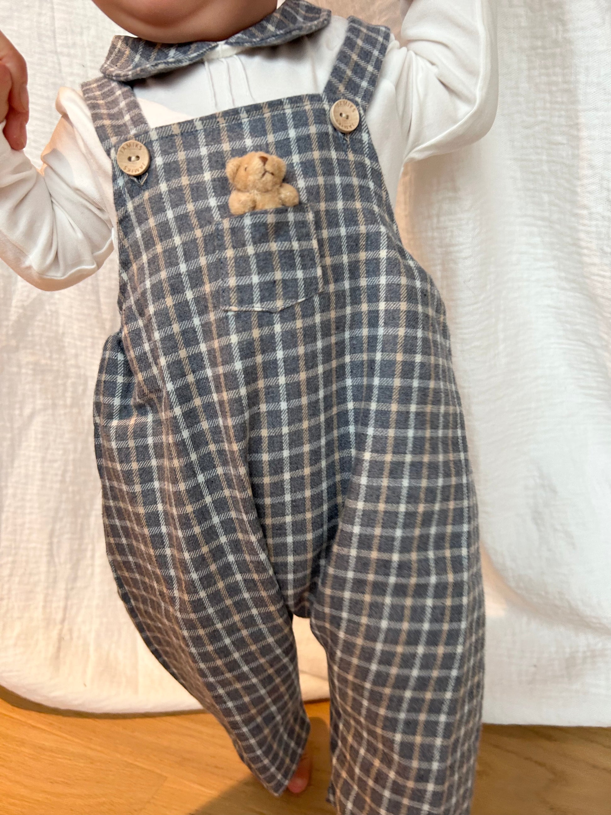 Myk og deilig snekkerbukse i rutete gråblå flanell. Søt liten bamse på brystet 🐻 Perfekt for lek og kos. Body følger ikke med.